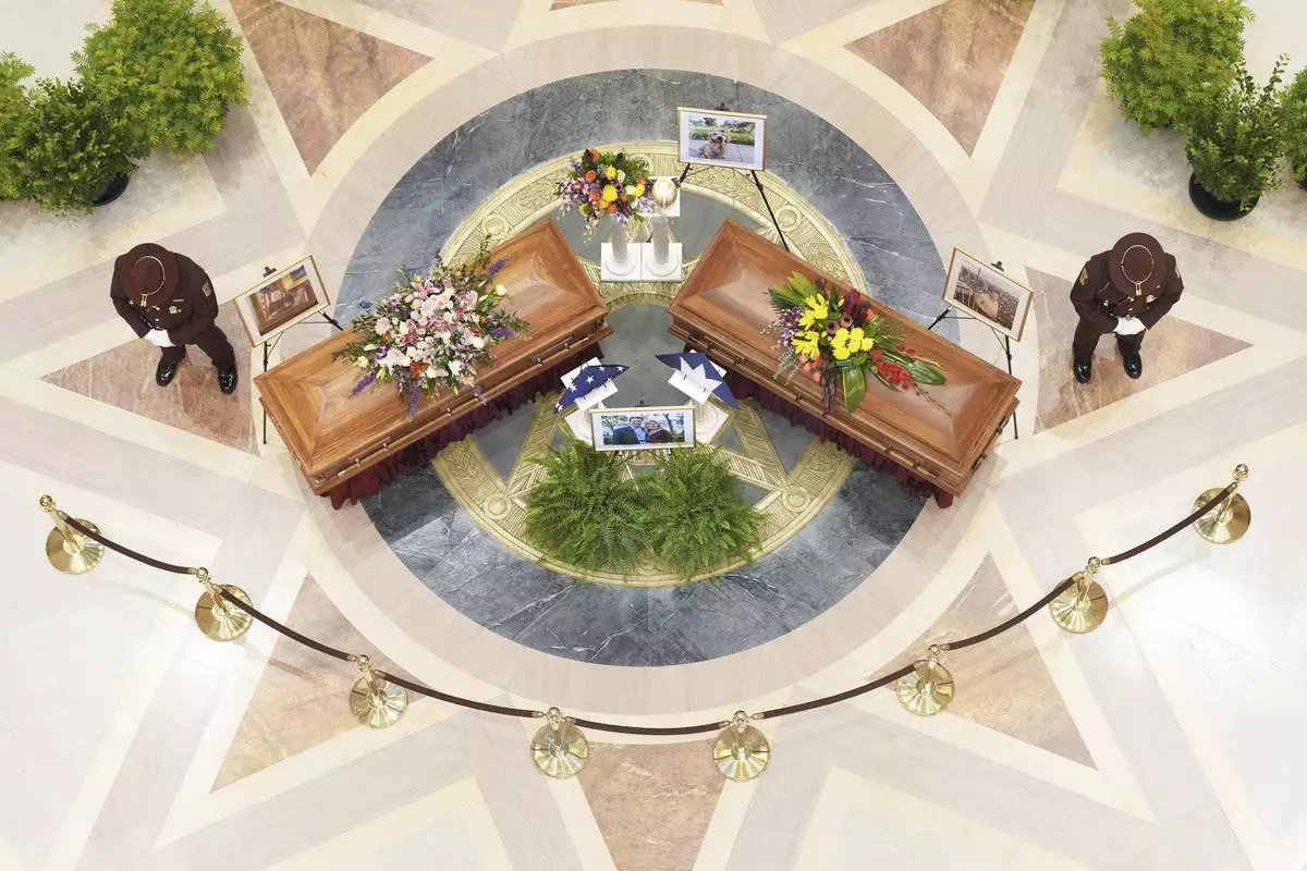The Hortmans' caskets and the dog's urn were arranged in the center of the rotunda, under the Capitol dome, with law enforcement officers keeping watch on either side as thousands of people who lined up filed by. Many fought back tears as they left.