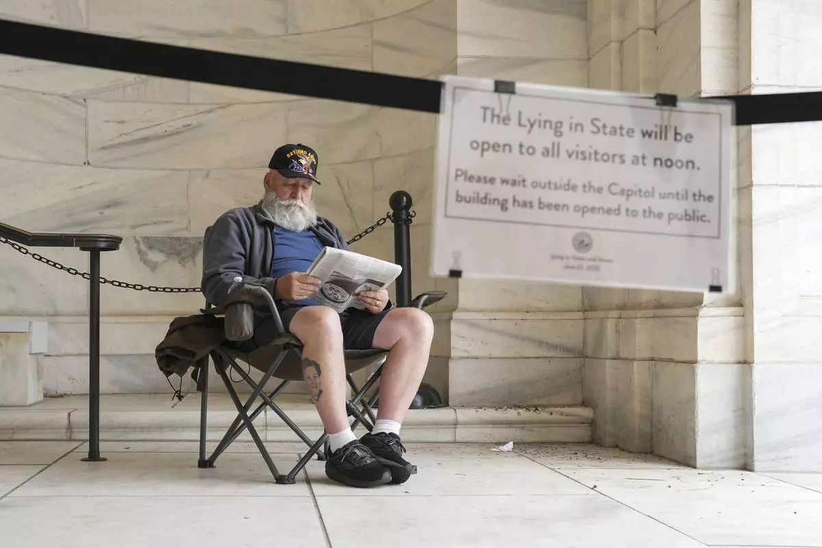 Mike Starr from Oak Grove, Minn. is the first person in line pay his respects to former Minnesota House Speaker Melissa Hortman, who will lie in state with her husband, Mark, and their golden retriever, Gilbert at the Minnesota Capitol rotunda on Friday, June 17, 2025 in St. Paul, Minn. (Alex Kormann/Star Tribune via AP)