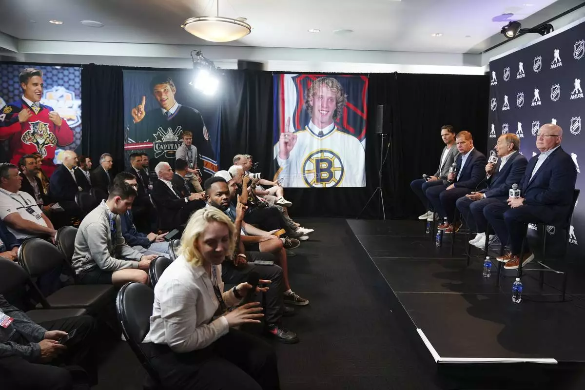 On stage from left to right, Ron Hainsey, NHLPA Assistant Executive Director; Marty Walsh, NHLPA Executive Director; Gary Bettman, NHL Commissioner, and Bill Daly, NHL Deputy Commissioner, conduct a joint press conference before the NHL hockey draft Friday, June 27, 2025, in Los Angeles. (AP Photo/Damian Dovarganes)