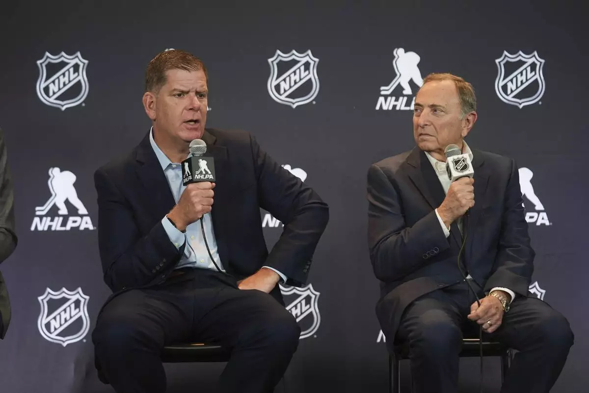 Marty Walsh, left, NHLPA Executive Director, and Gary Bettman, NHL Commissioner, conduct a joint press conference before the NHL hockey draft Friday, June 27, 2025, in Los Angeles. (AP Photo/Damian Dovarganes)