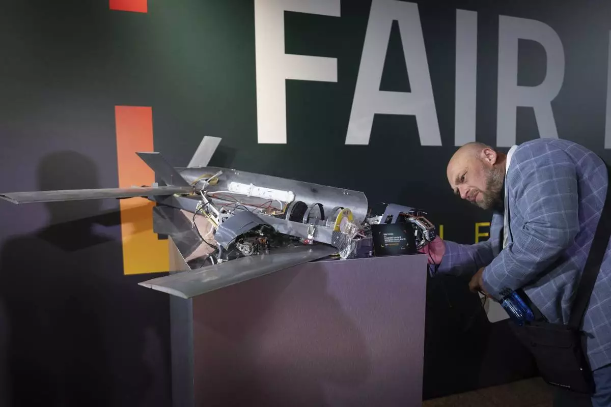 Visitors watch damaged Russian drones during the International Conference on Expanding Sanctions Against Russia in Kyiv, Ukraine, Friday, June 27, 2025. (AP Photo/Efrem Lukatsky)