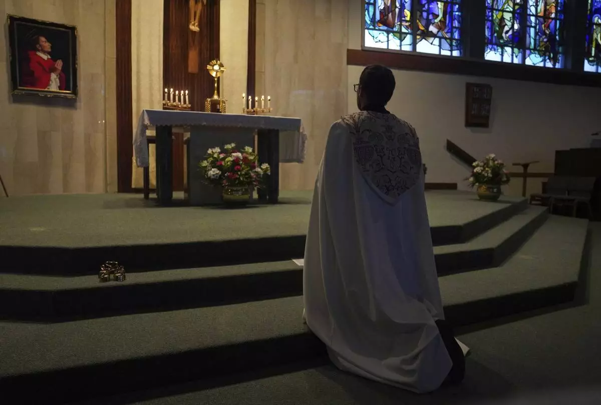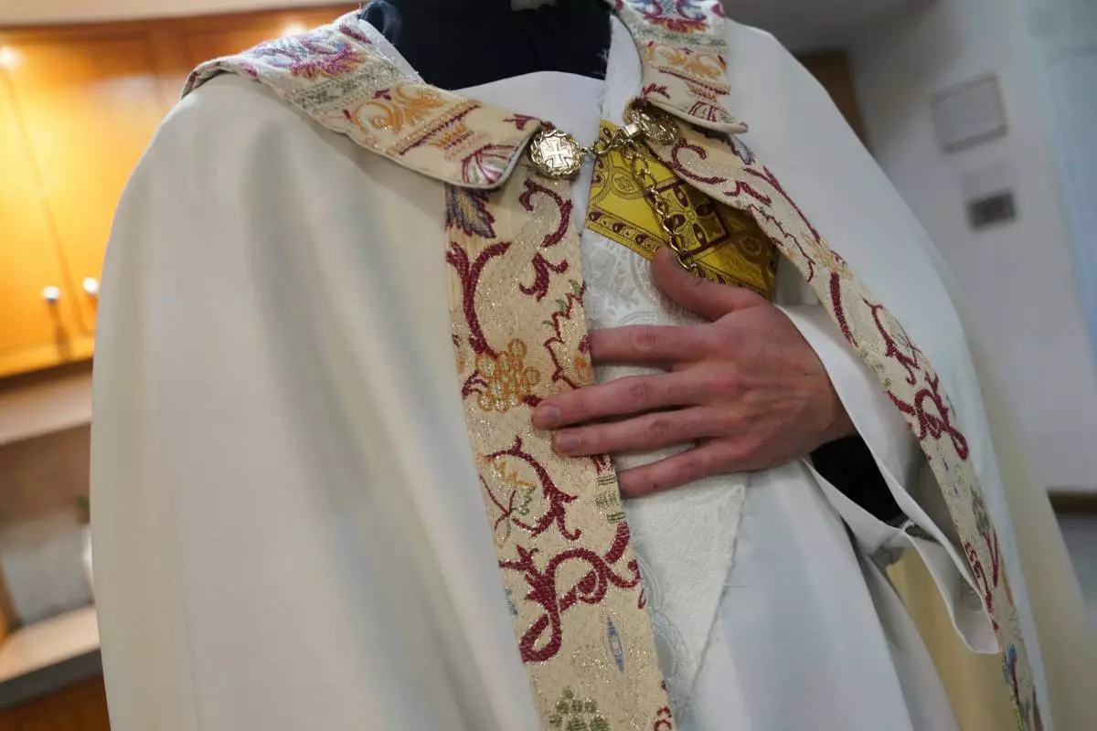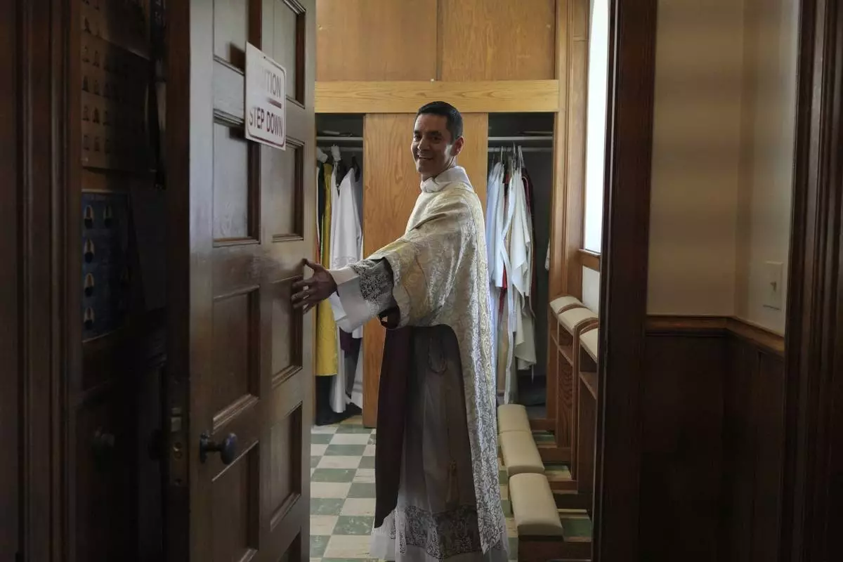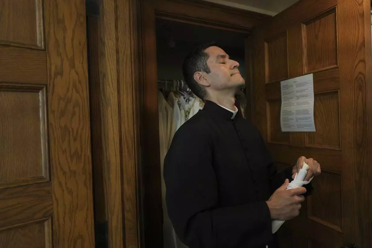 The Rev. Mike Sampson dresses for an evening meditation at St. Charles Borromeo Catholic Church in Arlington, Va., on Wednesday, May 28, 2025. (AP Photo/Jessie Wardarski)