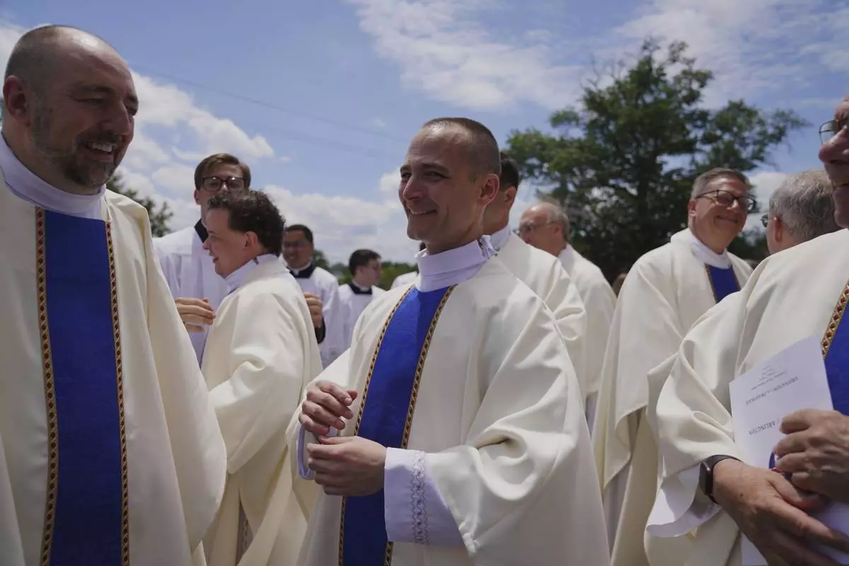 The Revs. Andrew Lewandowski, left, and Mike Sampson, center, stand among fellow priests after their ordination Mass at the Cathedral of Saint Thomas More in Arlington, Va., on Saturday, June 7, 2025. (AP Photo/Jessie Wardarski)