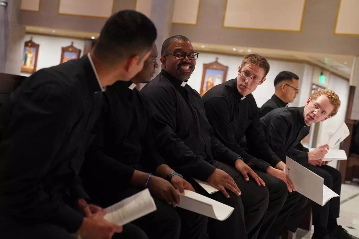 From left, the Rev. Alfredo Tuesta, the Rev. Christian Njodzela, the Rev. Ricky Malebranche, the Rev. Raymond Goins, the Rev. Jordan Evans, and the Rev. Emmanuel Carreno Garcia, attend rehearsal for their ordination Mass at the Cathedral of Saint Thomas More in Arlington, Va., on Friday, June 6, 2025. (AP Photo/Jessie Wardarski)