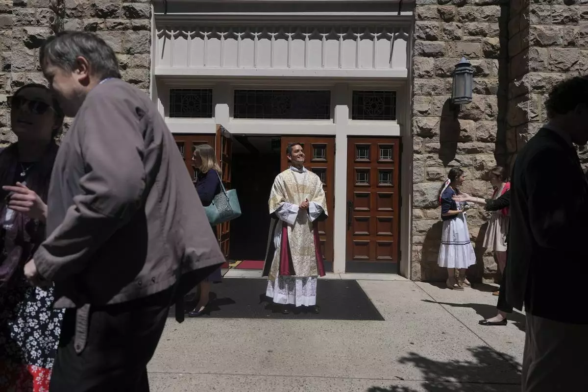 The Rev. Alfredo Tuesta smiles after greeting congregants at the end of a Mass at St. James Catholic Church, Falls Church, Va., on Sunday, May 24, 2025. (AP Photo/Luis Andres Henao)
