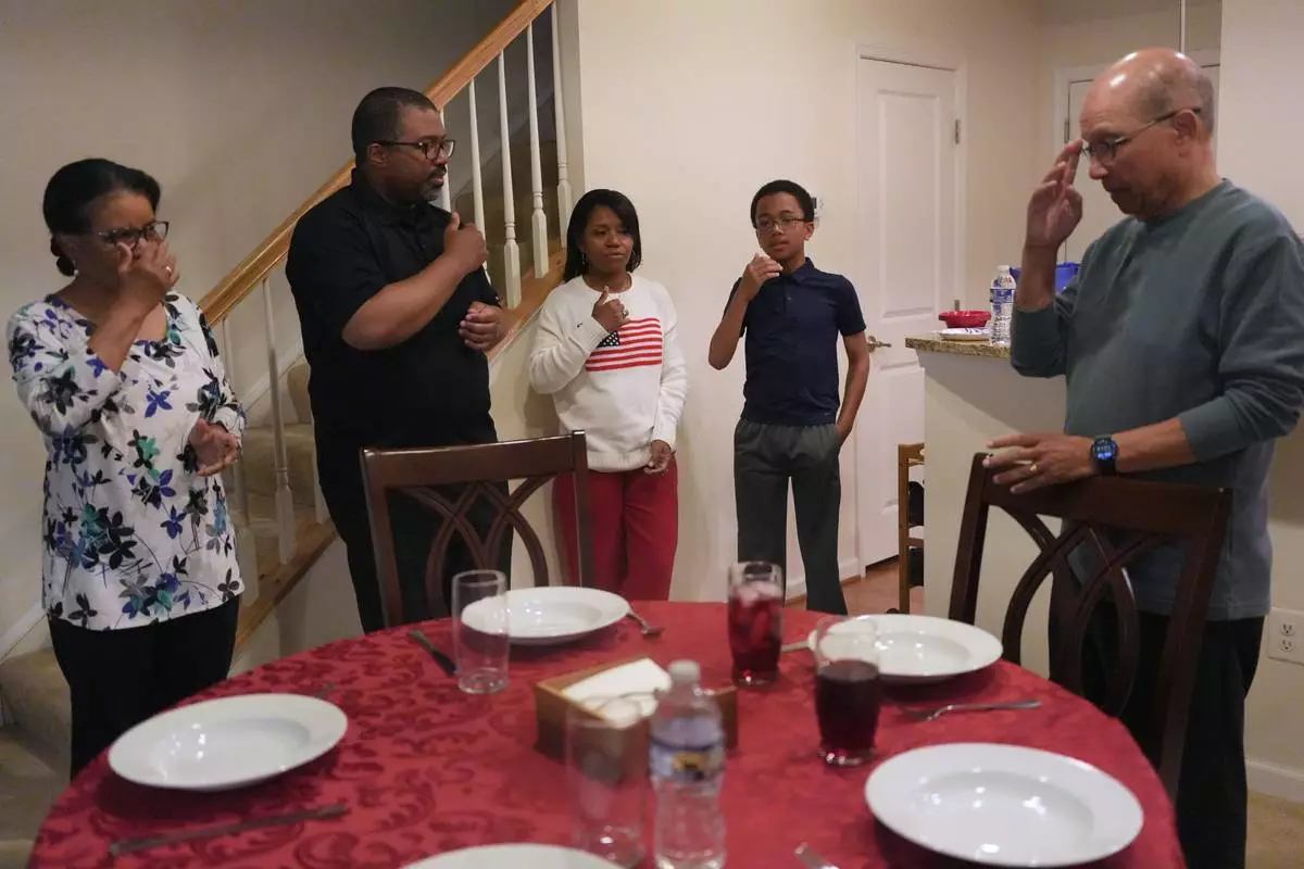 The Rev. Ricky Malebranche, second from left, makes the sign of the cross as he leads prayers before a family meal at his home in Gainesville, Va., on Sunday, May 25, 2025. (AP Photo/Luis Andres Henao)