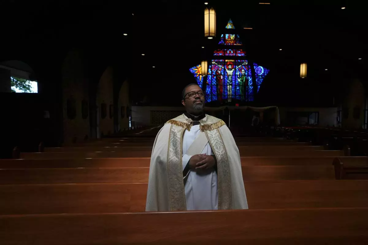 The Rev. Ricky Malebranche poses for a portrait after baptizing a child at St. Louis Catholic Church in Gainesville, Va., on Saturday, May 24, 2025. (AP Photo/Luis Andres Henao)