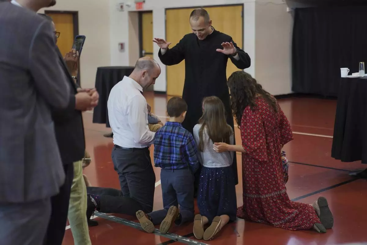 The Rev. Mike Sampson blesses the Hilgert family during a reception after his first Mass, given at St. Charles Borromeo Catholic Church in Arlington, Va., on Sunday, June 8, 2025. (AP Photo/Jessie Wardarski)
