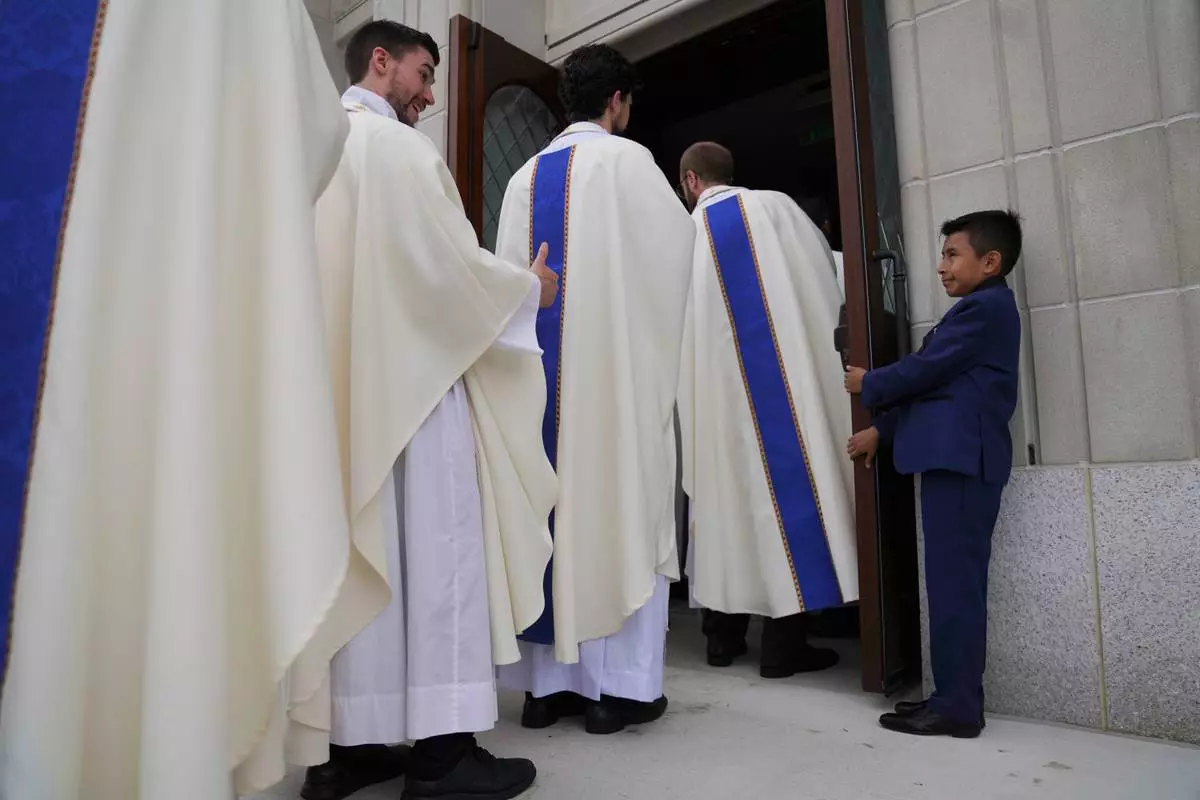 Priests greet a young usher while entering the Cathedral of Saint Thomas More for the ordination of 12 priests in Arlington, Va., on Saturday, June 7, 2025. (AP Photo/Jessie Wardarski)