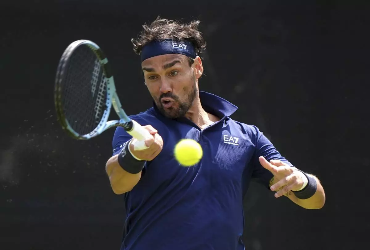 Italy's Fabio Fognini in action against Arthur Fery on day one of the Rothesay Open in Nottingham, England, Monday June 16, 2025. (Bradley Collyer/PA via AP)