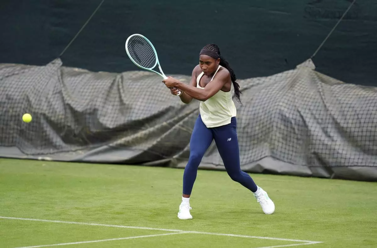 Coco Gauff of the U.S. hits a backhand during a practice session at the All England Lawn Tennis and Croquet Club, ahead of the Wimbledon Championships, which begins on June 30th, in London, Monday June 23, 2025. (Adam Davy/PA via AP)