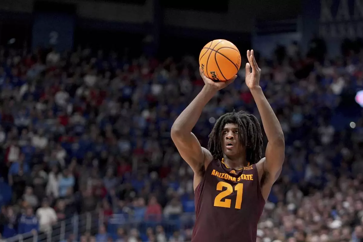 FILE - Arizona State forward Jayden Quaintance shoots during the second half of an NCAA college basketball game against Kansas, Wednesday, Jan. 8, 2025, in Lawrence, Kan. (AP Photo/Charlie Riedel, File)
