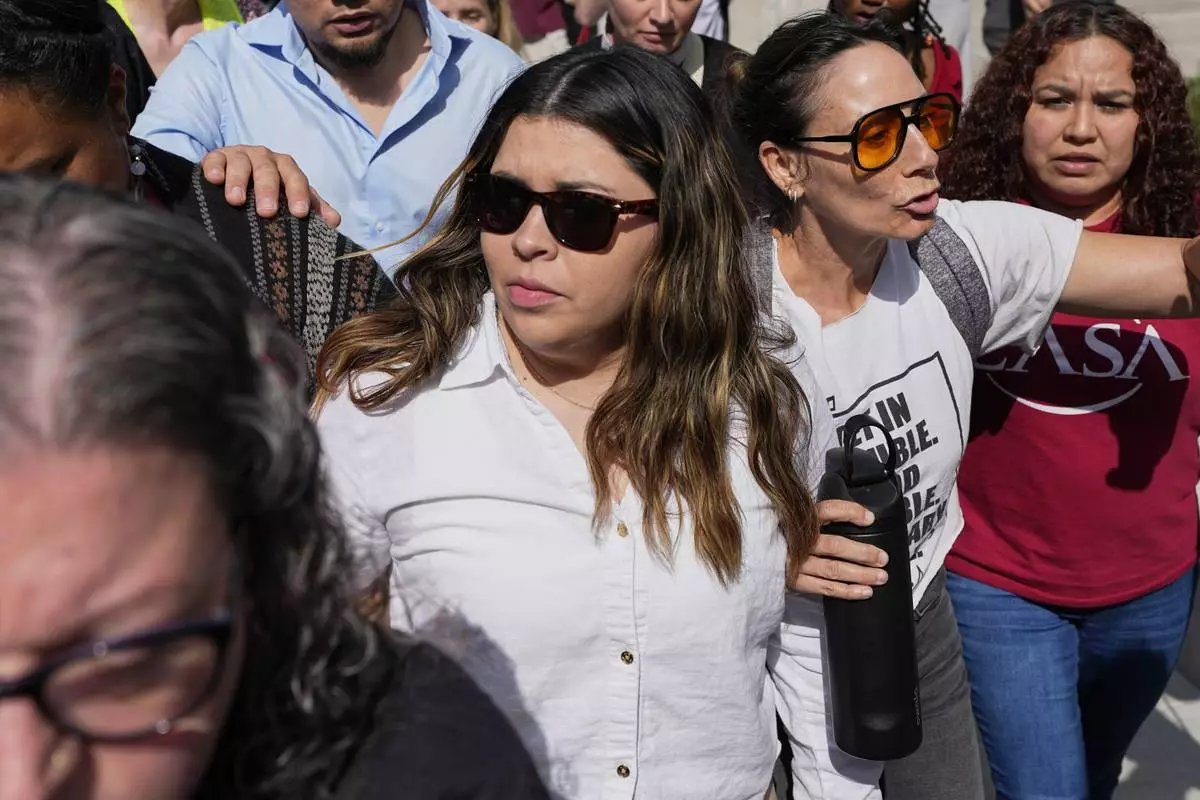 Jennifer Vasquez Sura, center left, wife of Kilmar Abrego Garcia leaves the federal courthouse Wednesday, June 25, 2025, in Nashville, Tenn. (AP Photo/George Walker IV)