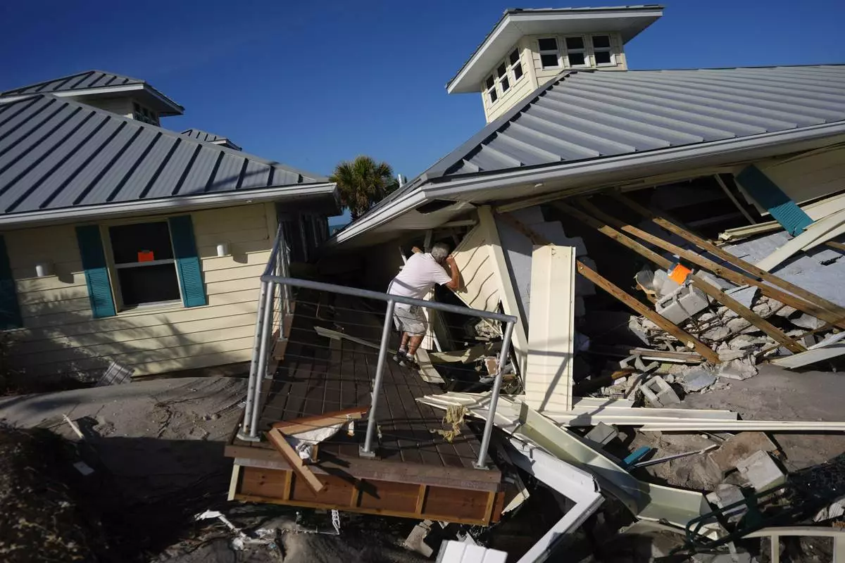 FILE - A property owner, who preferred not to give his name, peers into the remains of the second floor unit where he lived with his wife while renting out the other units, on Manasota Key, in Englewood, Fla., following the passage of Hurricane Milton, Oct. 13, 2024. (AP Photo/Rebecca Blackwell, File)