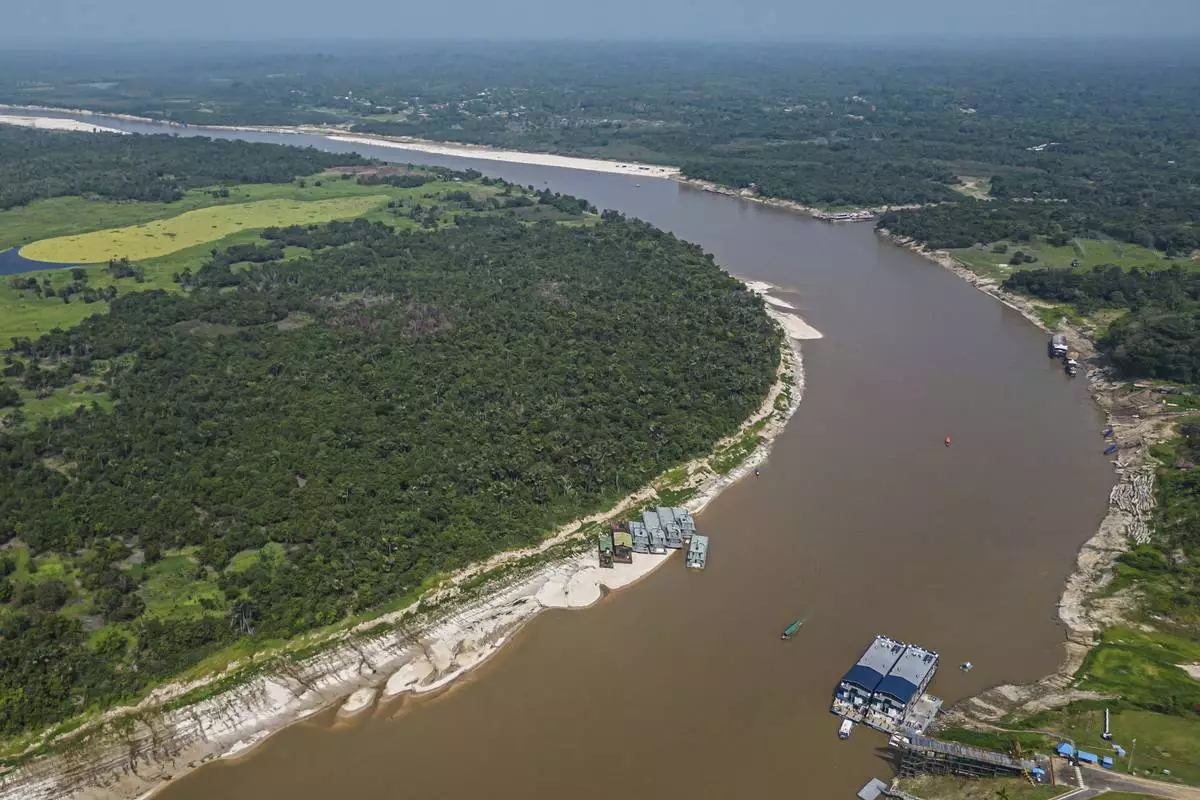 FILE - Boats sit on the shore of the Nanay River, a tributary of the Amazon, amid low water levels and drought in Iquitos, Peru, Sept. 10, 2024. (AP Photo/Cesar Von Bancles, File)