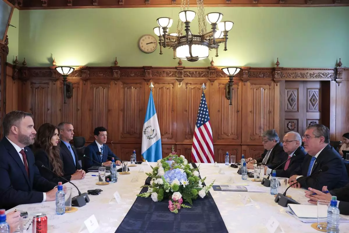 U.S. Homeland Security Secretary Kristi Noem, second from left, meets with Guatemalan President Bernardo Arevalo, right, at the National Culture Palace in Guatemala City, Thursday, June 26, 2025. (Anna Moneymaker/Pool photo via AP)