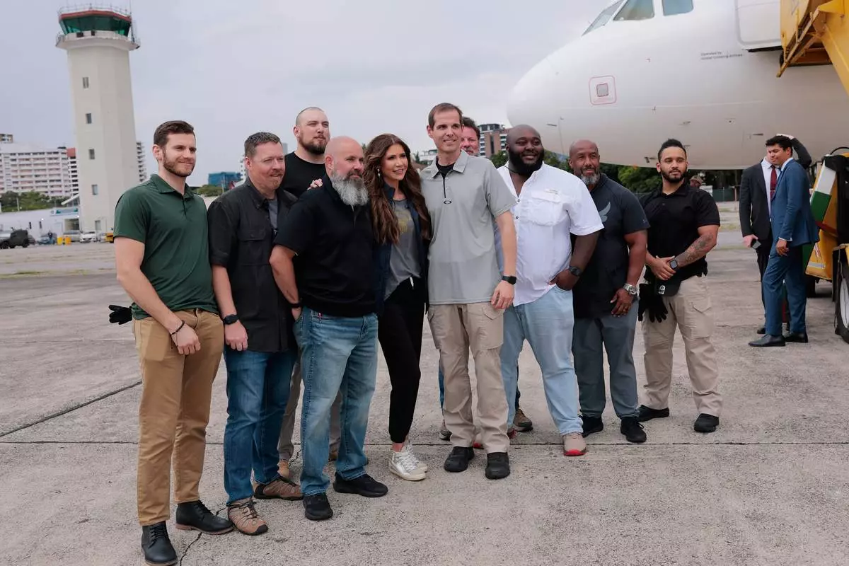 U.S. Homeland Security Secretary Kristi Noem poses for photos with air marshals and security officials at La Aurora International Airport in Guatemala City, June 26, 2025. (Anna Moneymaker/Pool Photo via AP)