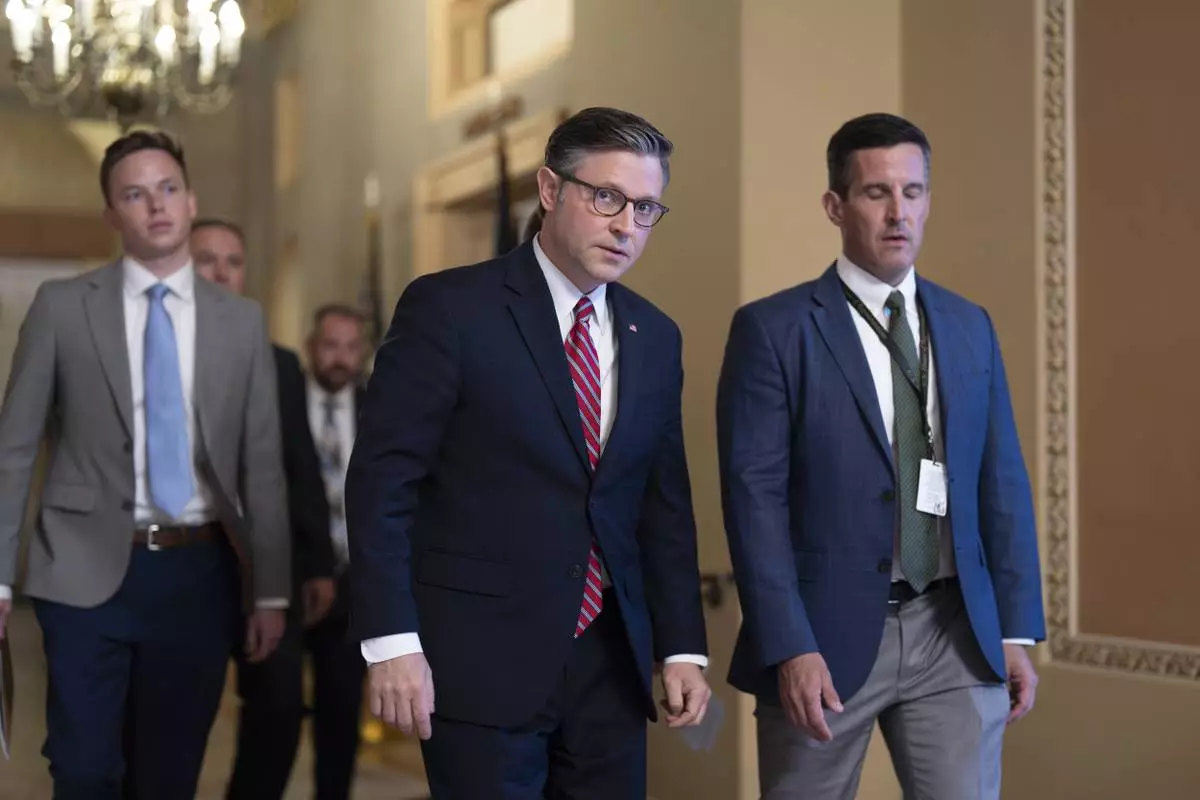 Speaker of the House Mike Johnson, R-La., center, arrives for a closed-door Republican meeting to advance President Donald Trump's sweeping domestic policy bill, at the Capitol in Washington, Friday, June 27, 2025. (AP Photo/J. Scott Applewhite)
