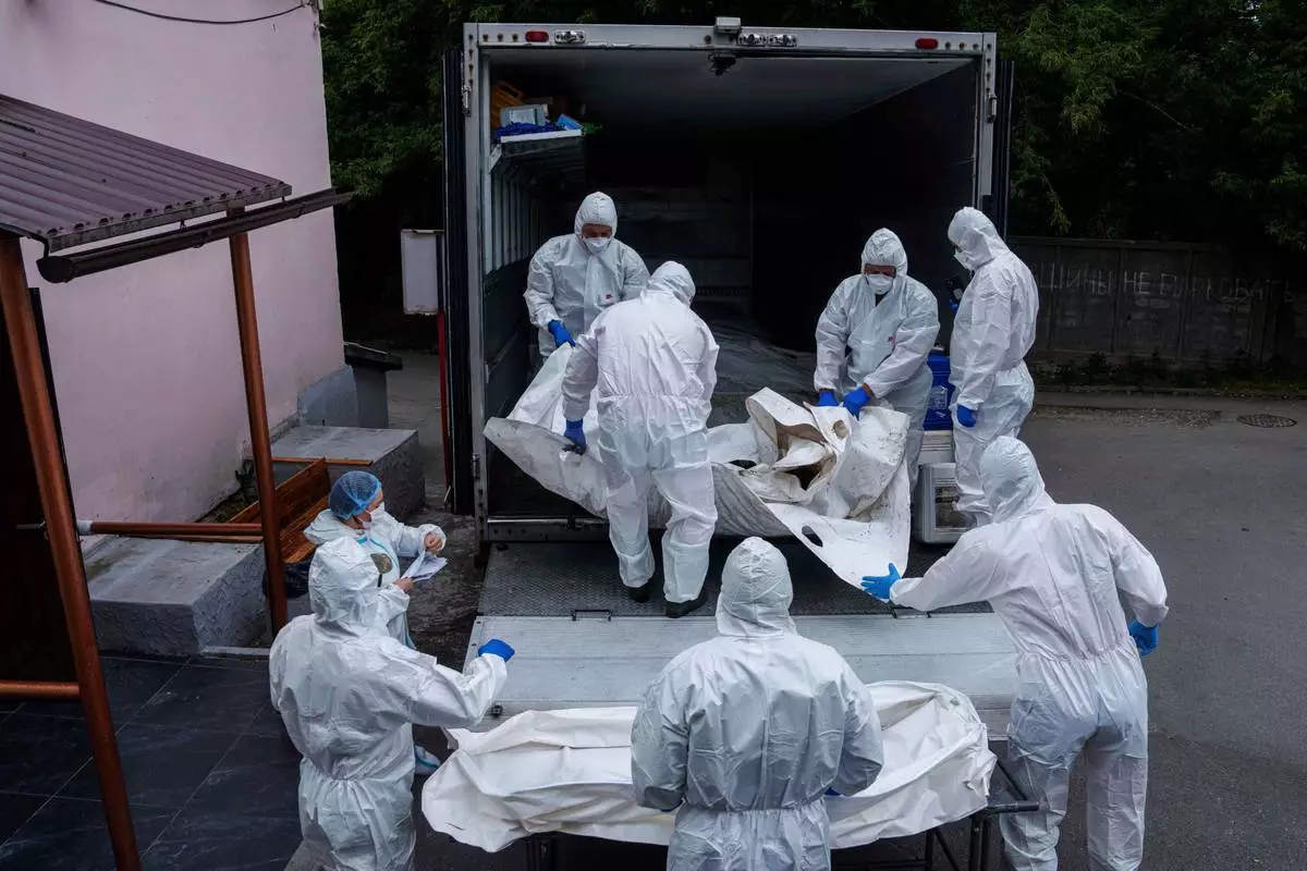 Ukrainian servicemen carry a body repatriated from Russia, at the morgue in Kyiv, Ukraine, on Thursday, June 26, 2025. (AP Photo/Evgeniy Maloletka)