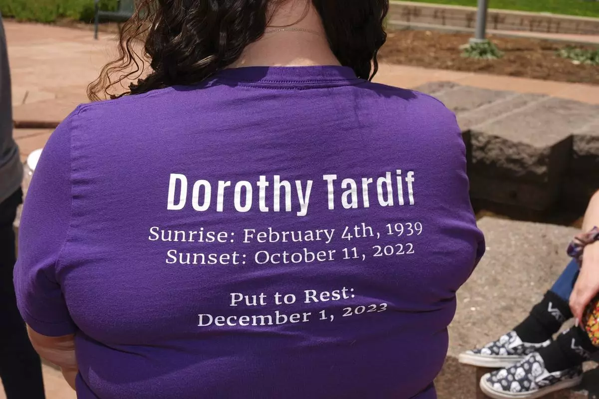 Samantha Naranjo of Colorado Springs, Colo., wears a shirt in honor of her late grandmother, Dorothy Tardiff, after a Colorado funeral home owner who stashed nearly 190 decomposing bodies was sentenced to 20 years prison on federal fraud charges, Friday, June 27, 2025, in Denver. (AP Photo/David Zalubowski)