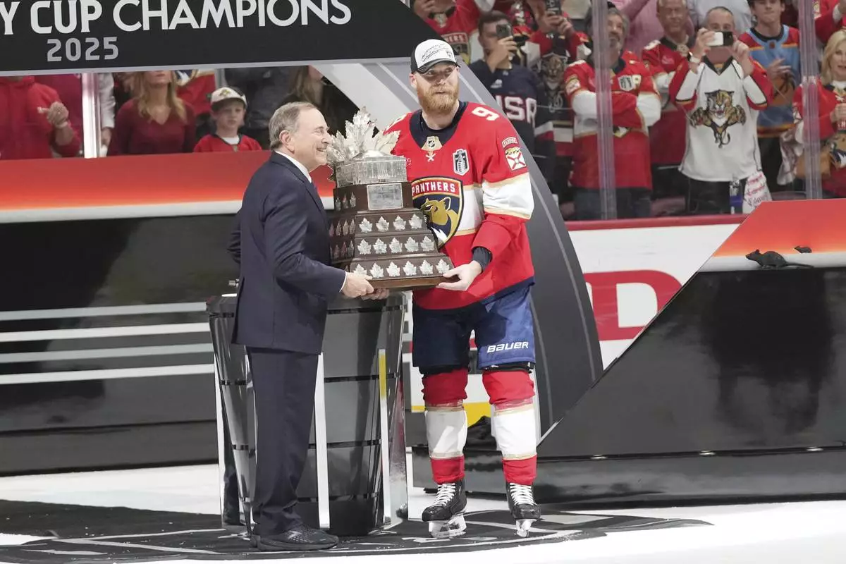 NHL commissioner Gary Bettman presents the Conn Smythe Trophy to Sam Bennett after defeating the Edmonton Oilers in Game 6 of the NHL hockey Stanley Cup Final Tuesday, June 17, 2025, in Sunrise, Fla. (AP Photo/Lynne Sladky)