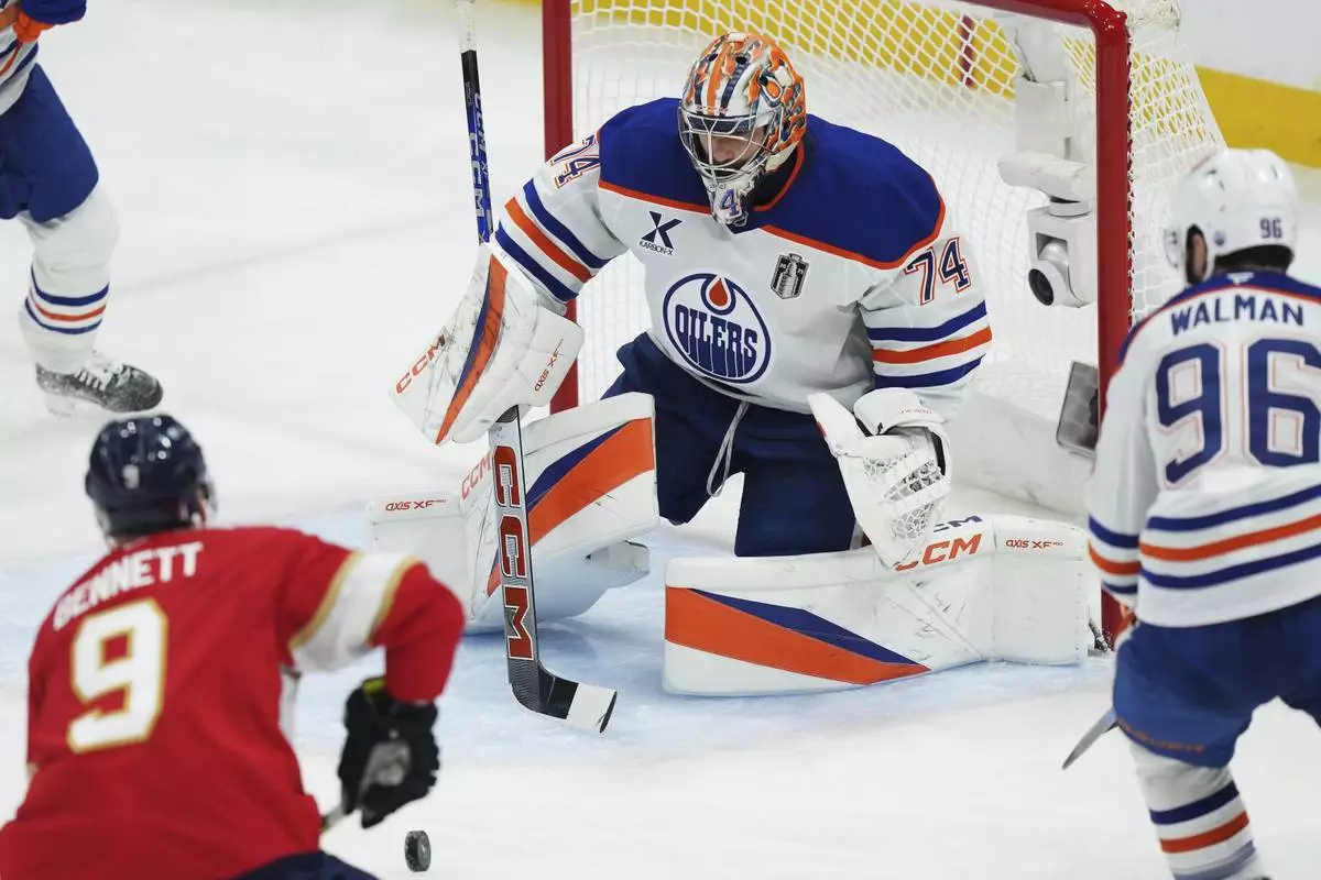 Edmonton Oilers goalie Stuart Skinner (74) stops Florida Panthers' Sam Bennett (9) during the second period in Game 6 of the NHL hockey Stanley Cup Final in Sunrise, Fla., Tuesday, June 17, 2025. (Nathan Denette/The Canadian Press via AP)