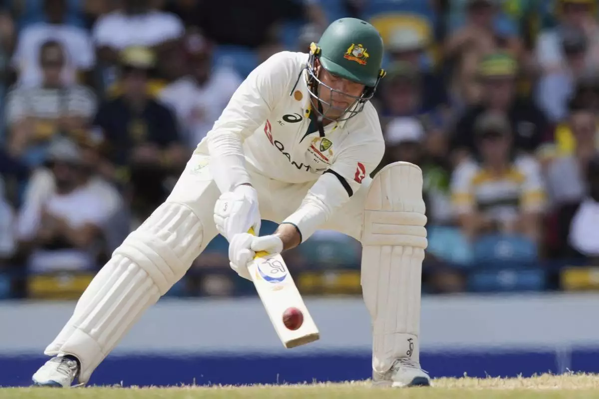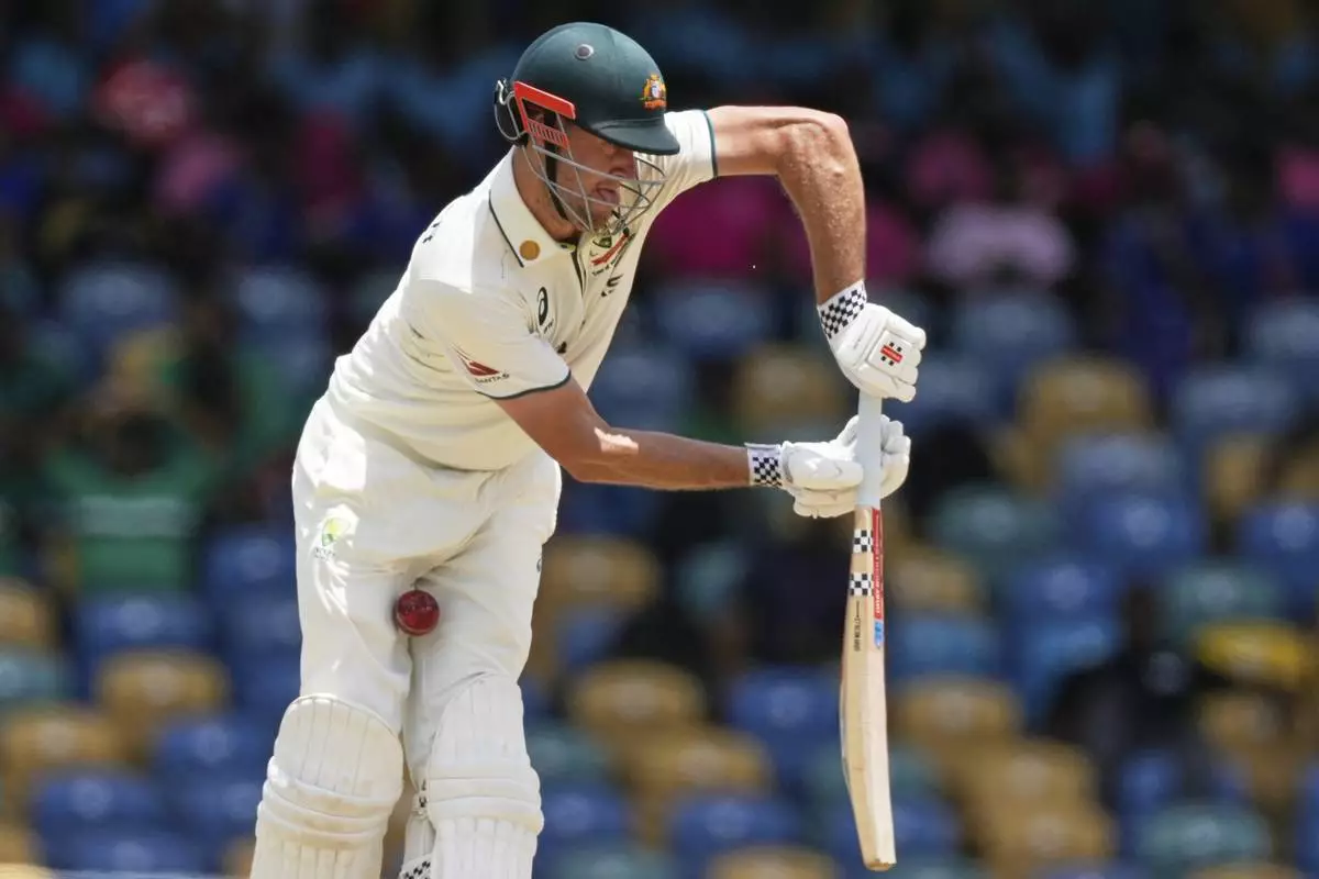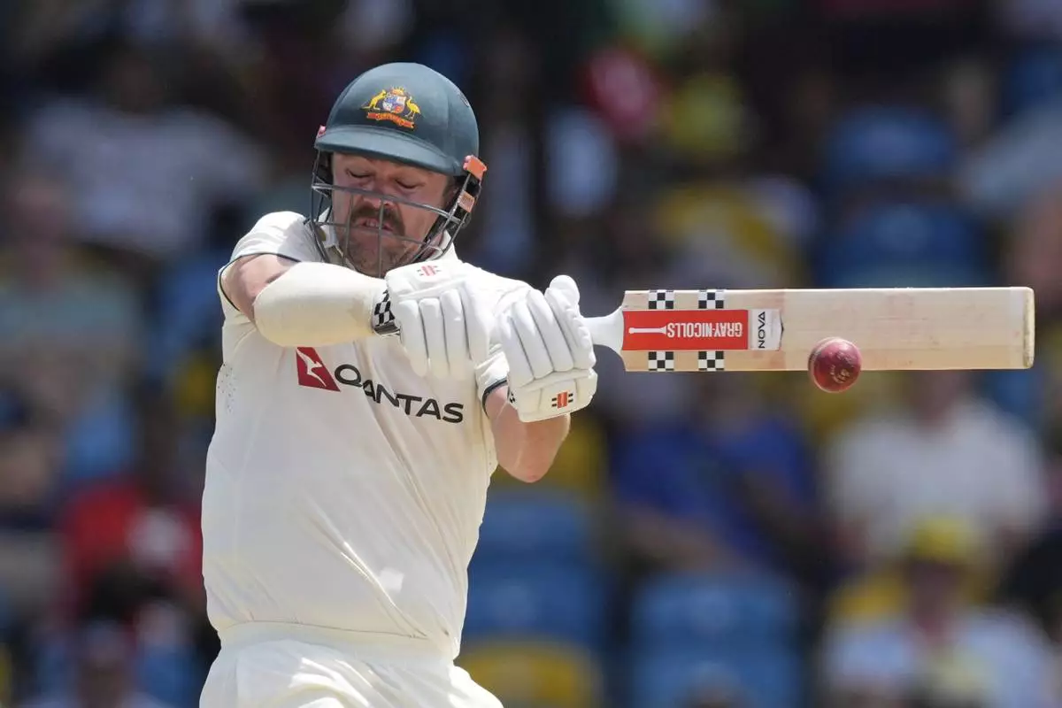 Australia's Beau Webster plays a shot against West Indies on day three of the first cricket Test match at Kensington Stadium in Bridgetown, Barbados, Friday, June 27, 2025. (AP Photo/Ricardo Mazalan)