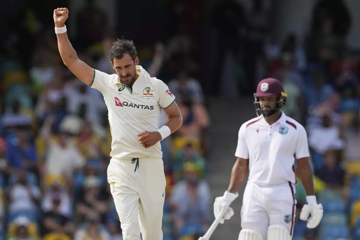 Australia's Mitchell Starc celebrates the dismissal of West Indies' Kraigg Brathwaite on day three of the first cricket Test match at Kensington Stadium in Bridgetown, Barbados, Friday, June 27, 2025. (AP Photo/Ricardo Mazalan)