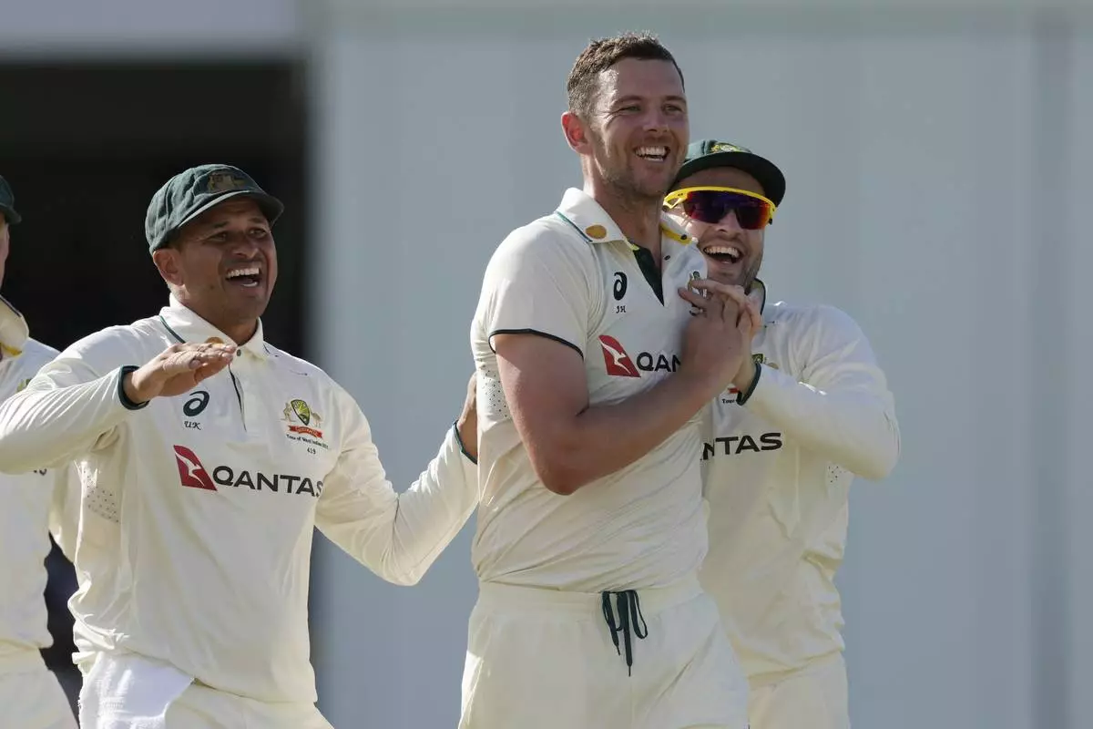 Australia's Josh Hazlewood, center, celebrates taking the wicket of West Indies' Brandon King on day three of the first cricket Test match at Kensington Stadium in Bridgetown, Barbados, Friday, June 27, 2025. (AP Photo/Ricardo Mazalan)