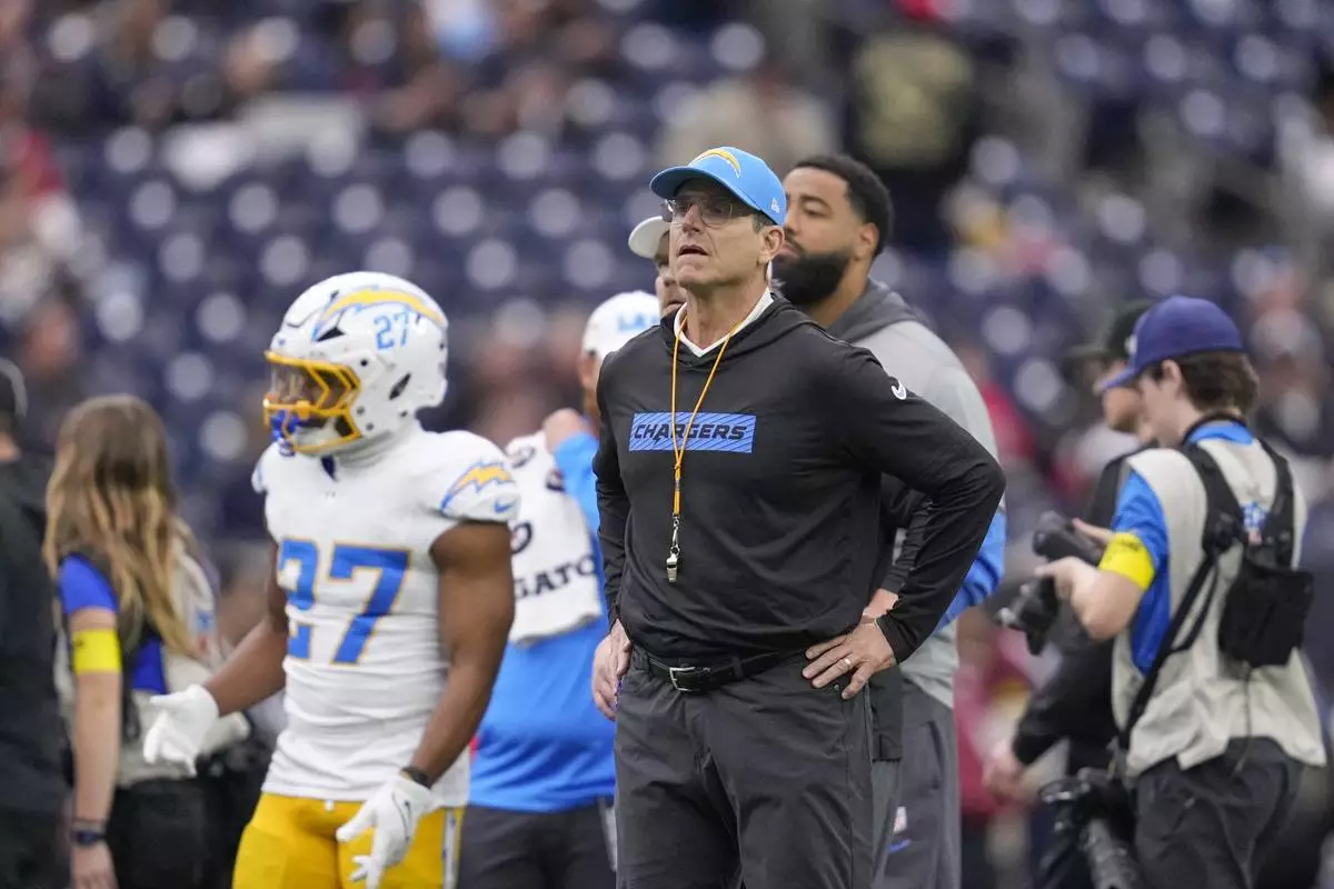 FILE - Los Angeles Chargers coach Jim Harbaugh watches players warm up before an NFL wild-card playoff football game against the Houston Texans, Jan. 11, 2025, in Houston. (AP Photo/Ashely Landis, File)