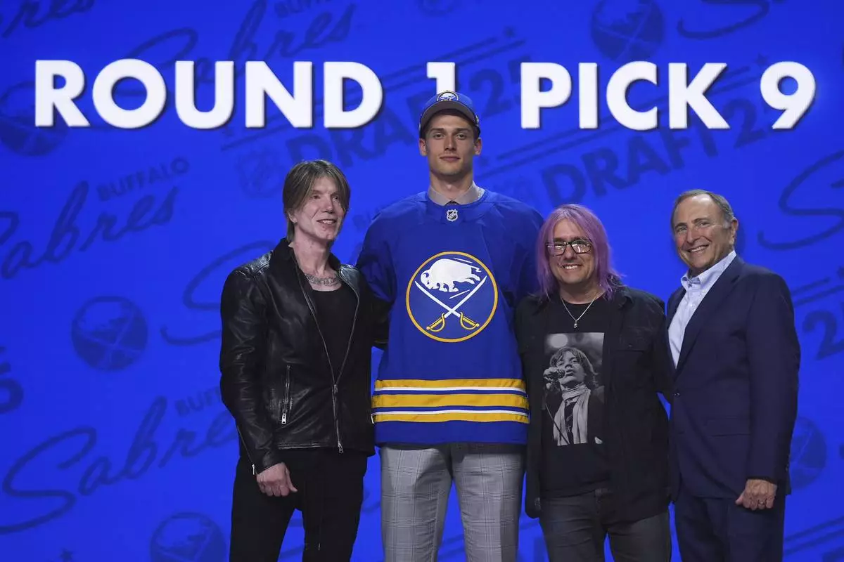 Radim Mrtka, middle left, stands between The Goo Goo Dolls' John Rzeznik, left, and Robby Takac, middle right, and NHL commissioner Gary Bettman after being drafted by the Buffalo Sabres during the NHL hockey draft Friday, June 27, 2025, in Los Angeles. (AP Photo/Damian Dovarganes)