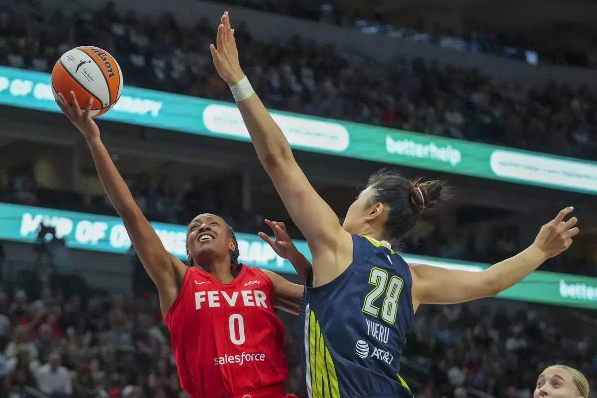 Indiana Fever guard Kelsey Mitchell (0) goes up for a basket against Dallas Wings center Li Yueru (28) during the first half of a WNBA basketball game Friday, June 27, 2025, in Dallas. (AP Photo/Julio Cortez)