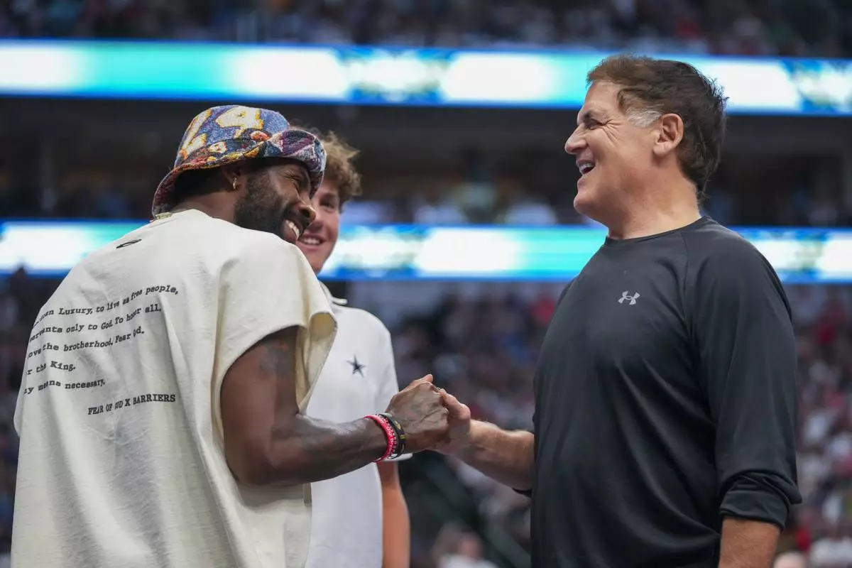 Dallas Mavericks' Kyrie Irving, left, talks with Mavericks minority owner Mark Cuban during the first half of a WNBA basketball game between the Dallas Wings and the Indiana Fever Friday, June 27, 2025, in Dallas. (AP Photo/Julio Cortez)