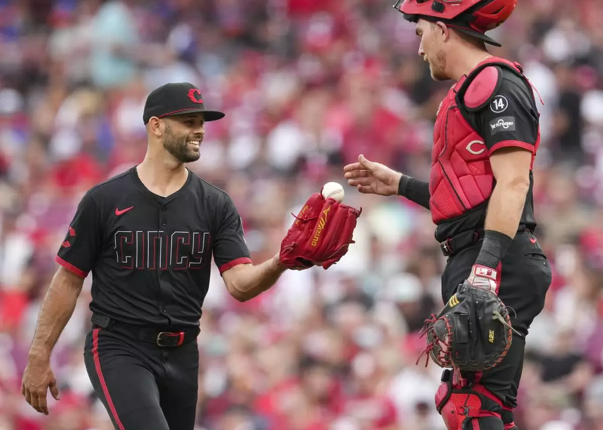 Cincinnati Reds pitcher Nick Martinez, left, speaks with catcher Tyler Stephenson at the pitcher's mound during the third inning of a baseball game against the San Diego Padres, Friday, June 27, 2025, in Cincinnati. (AP Photo/Jeff Dean)