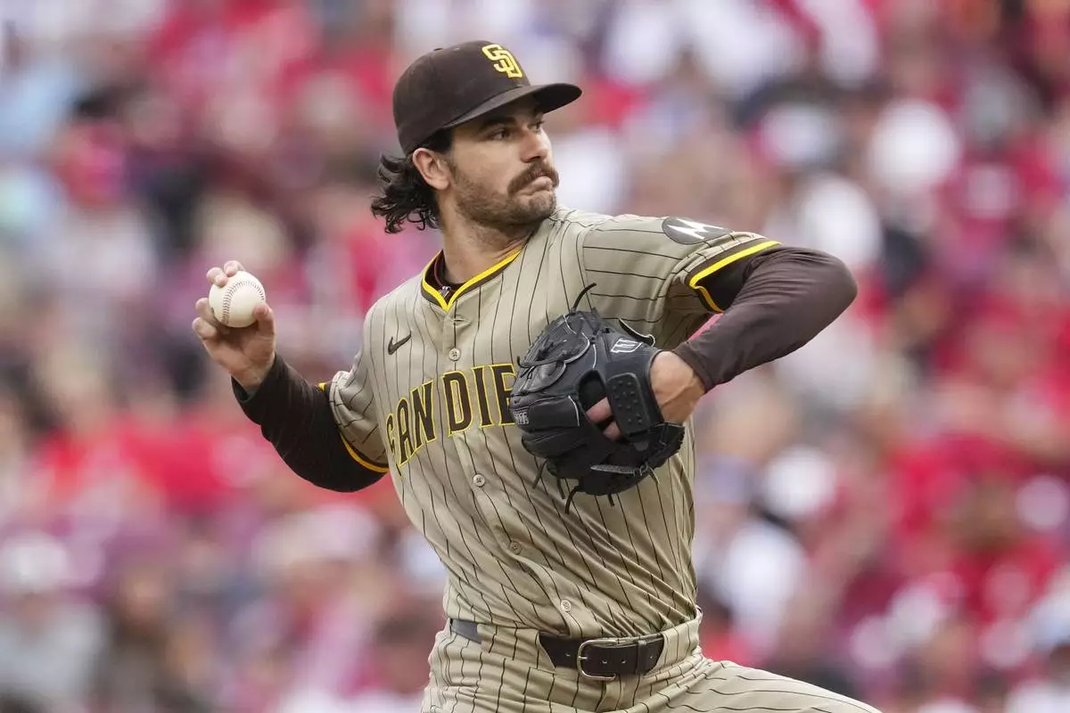 San Diego Padres pitcher Dylan Cease throws during the second inning of a baseball game against the Cincinnati Reds, Friday, June 27, 2025, in Cincinnati. (AP Photo/Jeff Dean)