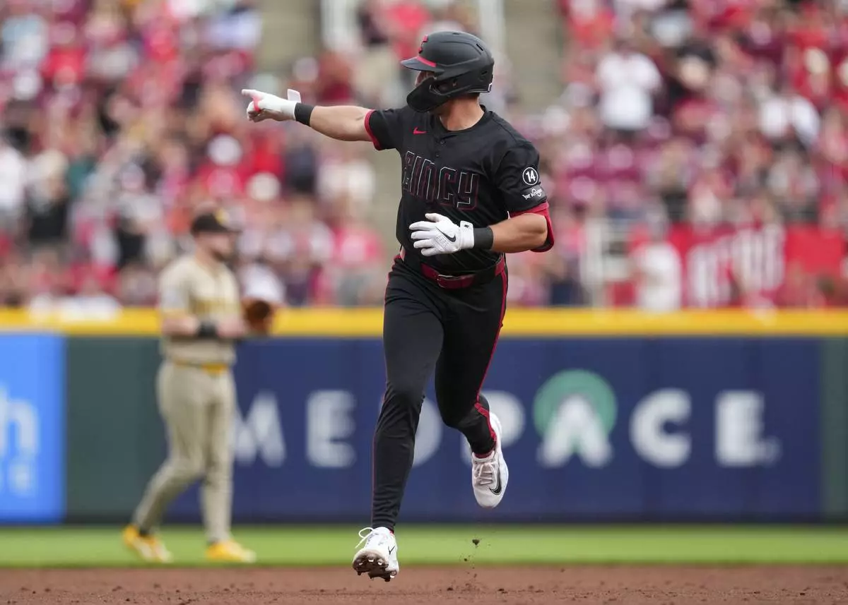 Cincinnati Reds' Spencer Steer gestures as he rounds the bases after hitting a solo home run during the second inning of a baseball game against the San Diego Padres, Friday, June 27, 2025, in Cincinnati. (AP Photo/Jeff Dean)