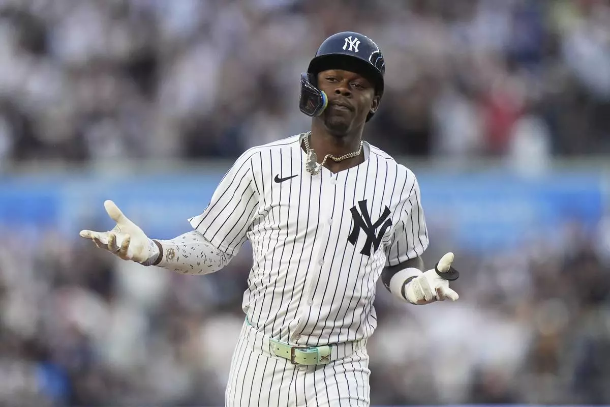 uNew York Yankees' Jazz Chisholm Jr. gestures as he runs the bases after hitting a home run during the second inning of a baseball game against the Athletics Friday, June 27, 2025, in New York. (AP Photo/Frank Franklin II)