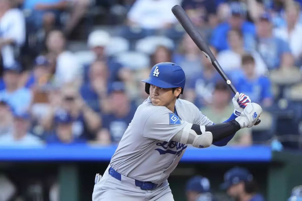 Los Angeles Dodgers' Shohei Ohtani gets ready to bat before hitting a solo home run during the first inning of a baseball game against the Kansas City Royals, Friday, June 27, 2025, in Kansas City, Mo. (AP Photo/Charlie Riedel)