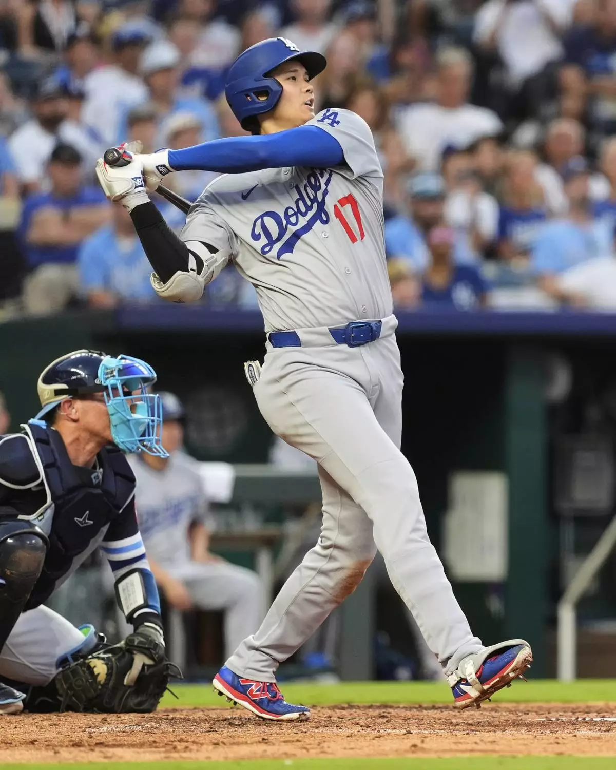 Los Angeles Dodgers' Shohei Ohtani watches his RBI triple during the fifth inning of a baseball game against the Kansas City Royals, Friday, June 27, 2025, in Kansas City, Mo. (AP Photo/Charlie Riedel)