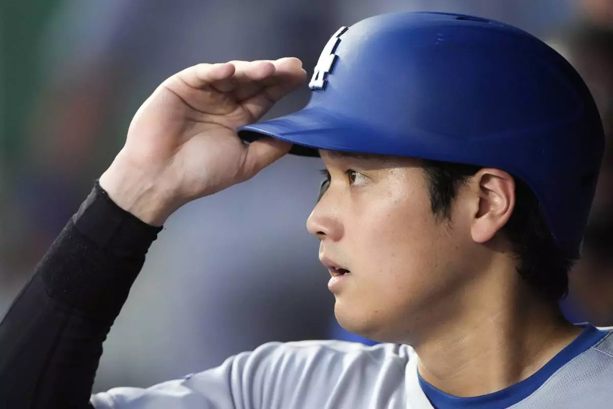 Los Angeles Dodgers' Shohei Ohtani watches from the dugout during the fifth inning of a baseball game against the Kansas City Royals, Friday, June 27, 2025, in Kansas City, Mo. (AP Photo/Charlie Riedel)