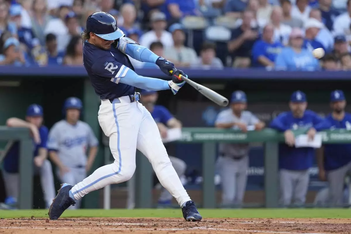 Kansas City Royals' Bobby Witt Jr. hits a two-run home run during the second inning of a baseball game against the Los Angeles Dodgers, Friday, June 27, 2025, in Kansas City, Mo. (AP Photo/Charlie Riedel)