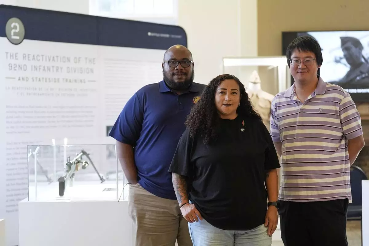 From left, Director of Exhibitions Cale Carter II, Director of Education Dr. Michelle Tovar, and archivist Jason Fung pose for a photo inside the Buffalo Soldiers National Museum on Friday, June 27, 2025, in Houston, Texas. (AP Photo/Ashley Landis)