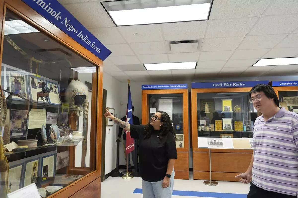 Director of Education Dr. Michelle Tovar, center, and archivist Jason Fung describe how current displays will be redone inside the Buffalo Soldiers National Museum on Friday, June 27, 2025, in Houston, Texas. (AP Photo/Ashley Landis)