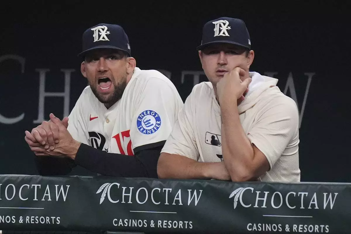 Texas Rangers starting pitcher Nathan Eovaldi, left, looks on from the dugout with teammate Tyler Mahle, right, during the fourth inning of a baseball game against the Seattle Mariners, Friday, June 27, 2025, in Arlington, Texas. (AP Photo/LM Otero)