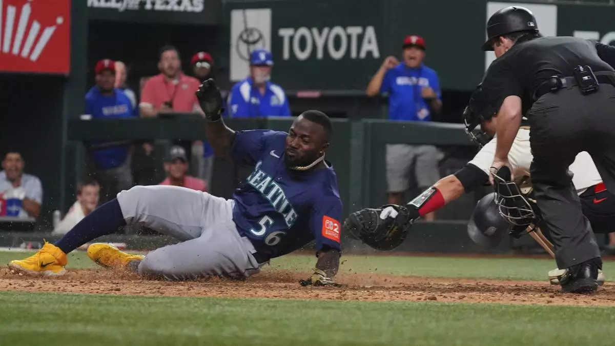 Seattle Mariners' Randy Arozarena (56) scores against Texas Rangers catcher Kyle Higashioka, back right, during the 12th inning of a baseball game, Friday, June 27, 2025, in Arlington, Texas. (AP Photo/LM Otero)