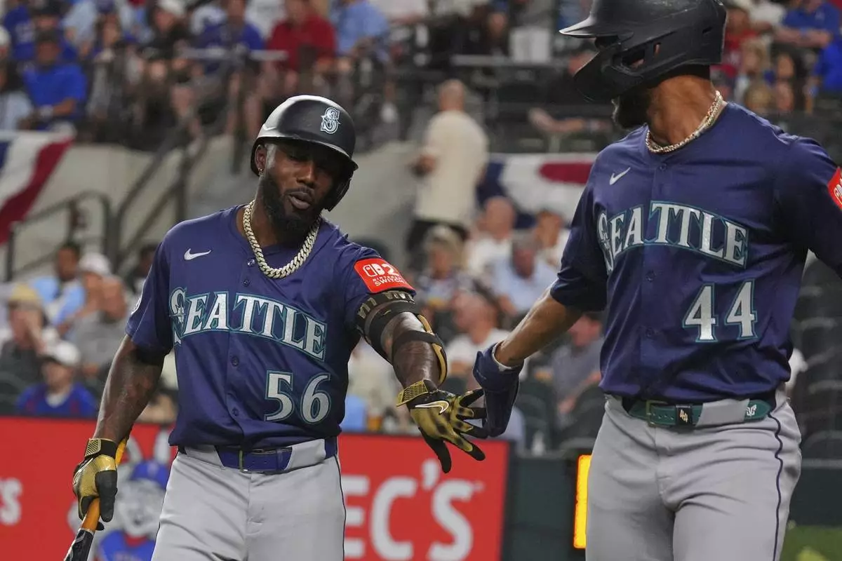 Seattle Mariners Randy Arozarena (56) gets a congratulations for the sacrifice fly that scored teammate Julio Rodríguez (44) during the third inning of a baseball game against the Texas Rangers, Friday, June 27, 2025, in Arlington, Texas. (AP Photo/LM Otero)