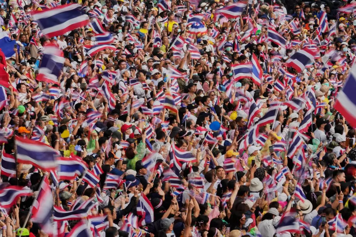 About 20,000 protesters joined the rally as of Saturday night, according to an estimate by the Bangkok police. Despite a downpour in the afternoon, they held national flags and placards around the Victory Monument in central Bangkok as speakers took turns blasting the government. The participants, many of whom came in the morning, chanted slogans, sang and danced to nationalist songs.