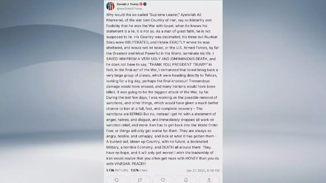 Trump said that Iranian Supreme Leader Ali Khamenei claimed that Iran had won the war against Israel, which is not true.