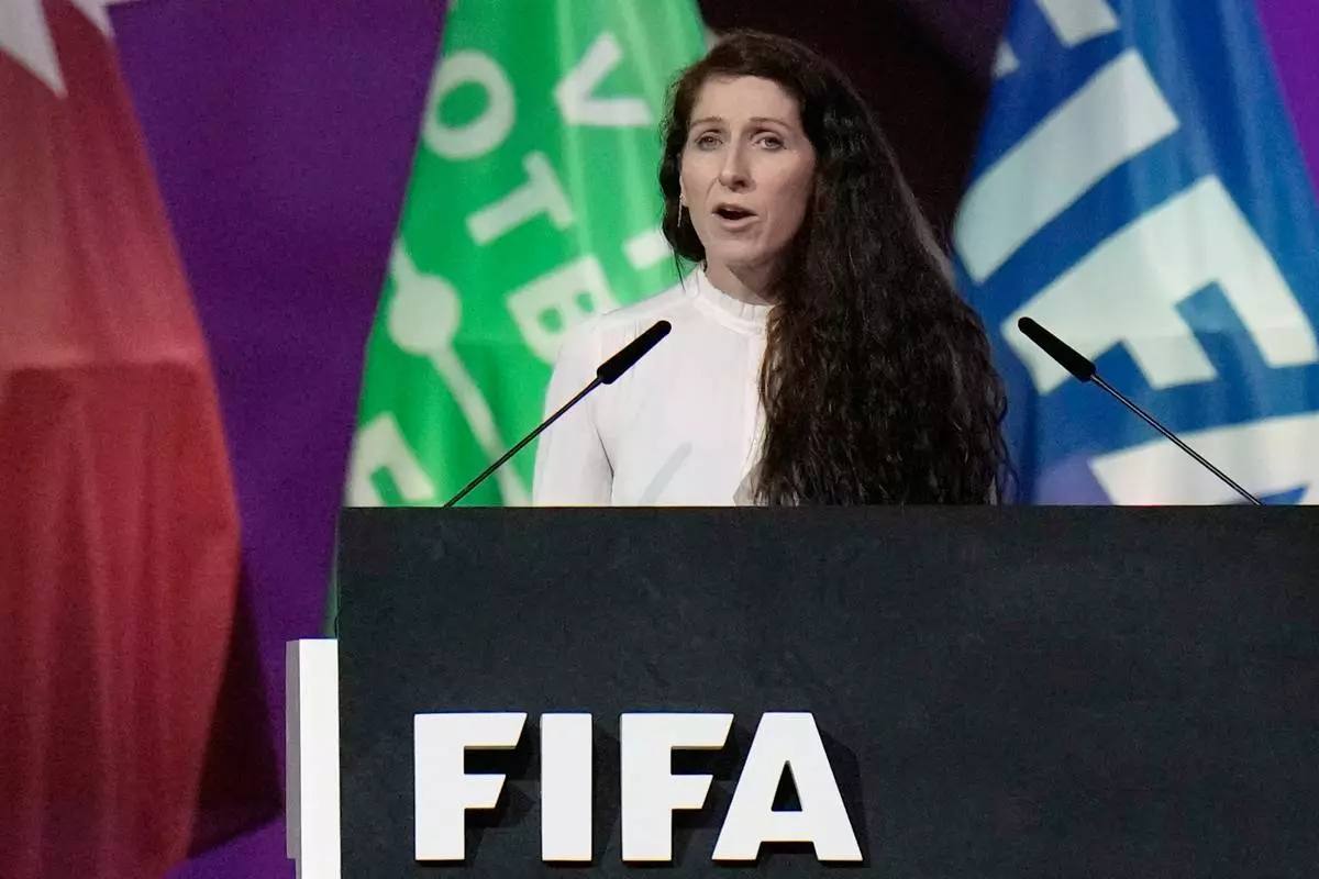 FILE - Norwegian federation president Lise Klaveness speaks during the FIFA congress at the Doha Exhibition and Convention Center in Doha, Qatar, on March 31, 2022. (AP Photo/Hassan Ammar, File)