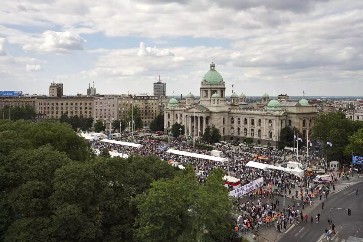 People attend a major anti-government rally in Belgrade, Serbia, Saturday, June 28, 2025. (AP Photo/Marko Drobnjakovic)